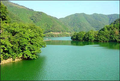 ▲赤い吊橋を渡る時に見た風景。鱒淵ダムの湖面は静だった。
