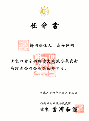 | ▲高安伸明・新会長に授与された「会長任命書」