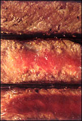 例えば、ステーキや焼き肉の場合、加熱具合によるが、レア(rare/強火で外側をさっと焼き、中は赤く生に近い状態。左掲載写真・下)とウェルダン(well-done/中まで十分に焼けている状態。左掲載写真・上)の中間状態のミディアム(medium/中心部だけピンク色で周りはほどよく火の通った状態。左掲載写真・中)で、生肉の約25倍のジメチルニトロソアミンが生成・含有されると言われる。