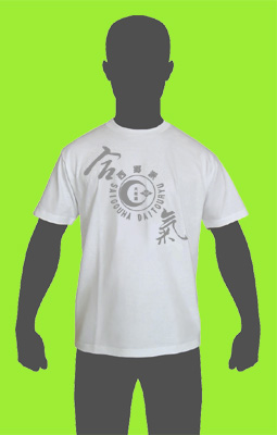 | ▲旧デザインの紺地に灰色銀でプリントされた西郷派大東流のオリジナルTシャツ。(※現在は販売終了) | ▲旧デザインの白地に灰色銀でプリントされた西郷派大東流のオリジナルTシャツ。 販売数が少ないレアな商品。(※現在は販売終了) |